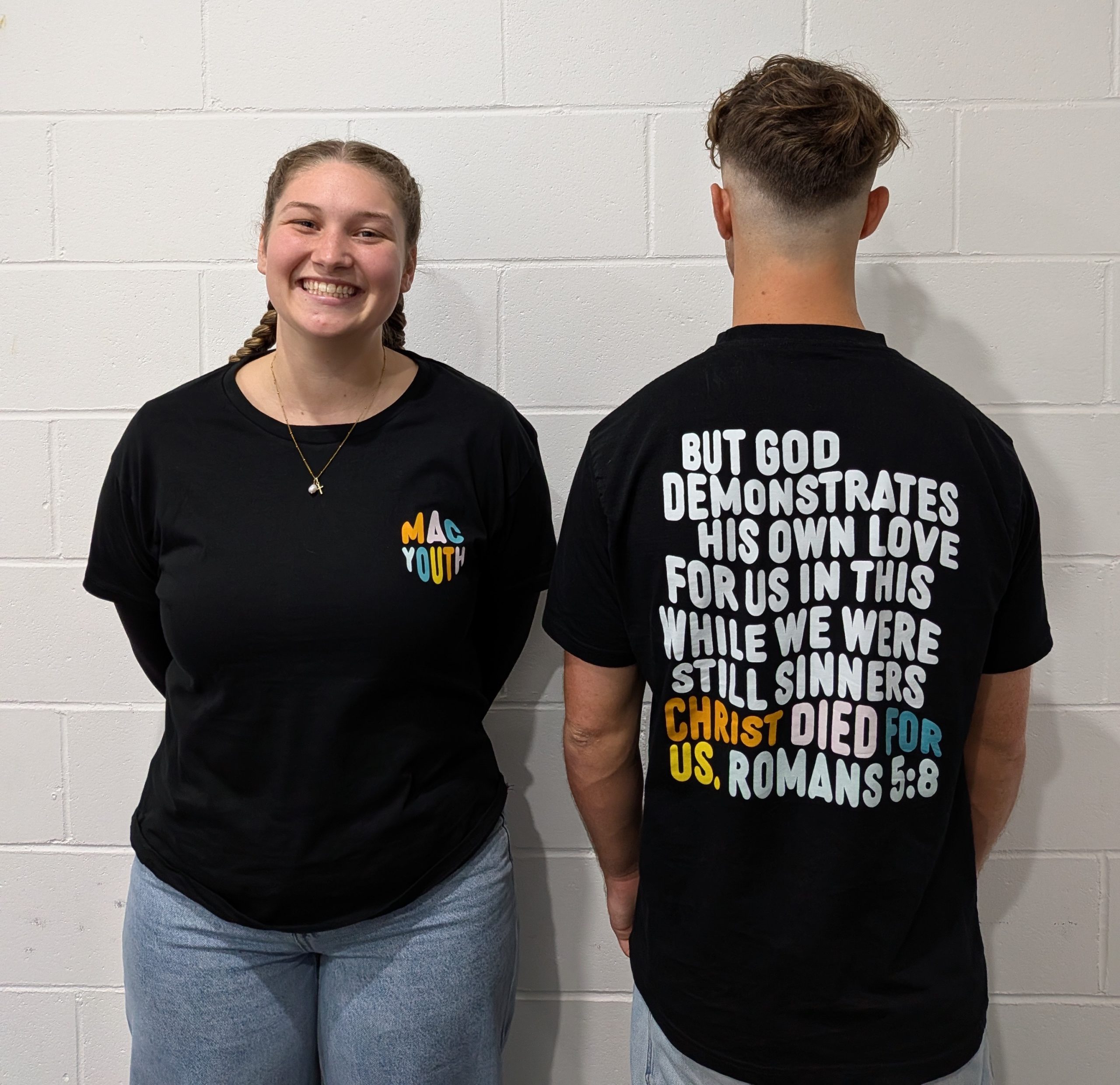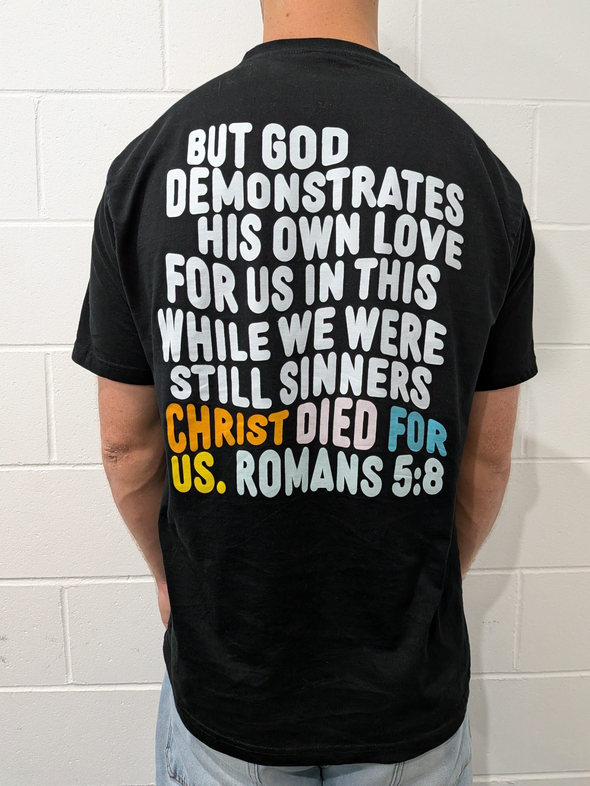 Back: “But God demonstrates his own love for us in this while we were still sinners Christ died for us. Romans 5:8”